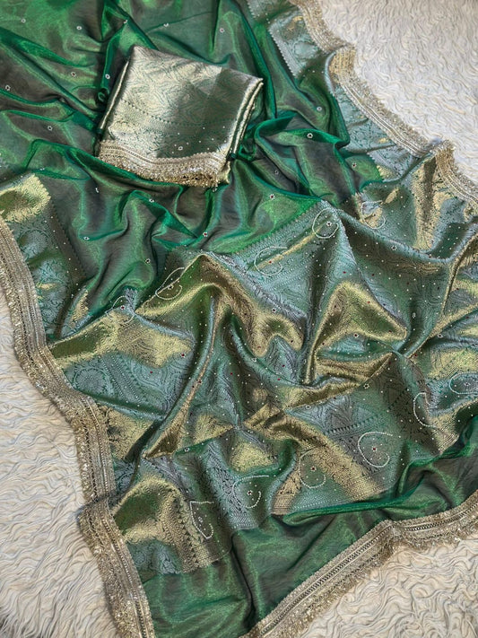 Green Banarasi Tissue Silk Saree Classy Stone Work With Lace