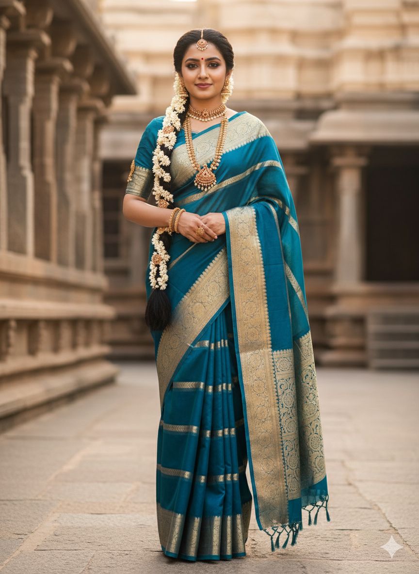 Celebrate tradition with our exquisite Kanjipuram Silk Saree, famous for its rich silk fabric, bold colors, and intricate zari work. Woven in the temple town of Kanchipuram, these sarees are a symbol of grace and grandeur, perfect for weddings, festivals, and traditional occasions. Made from pure mulberry silk, each Kanjivaram saree features classic motifs, broad borders, and shimmering gold zari—making it a cherished heirloom in every wardrobe.