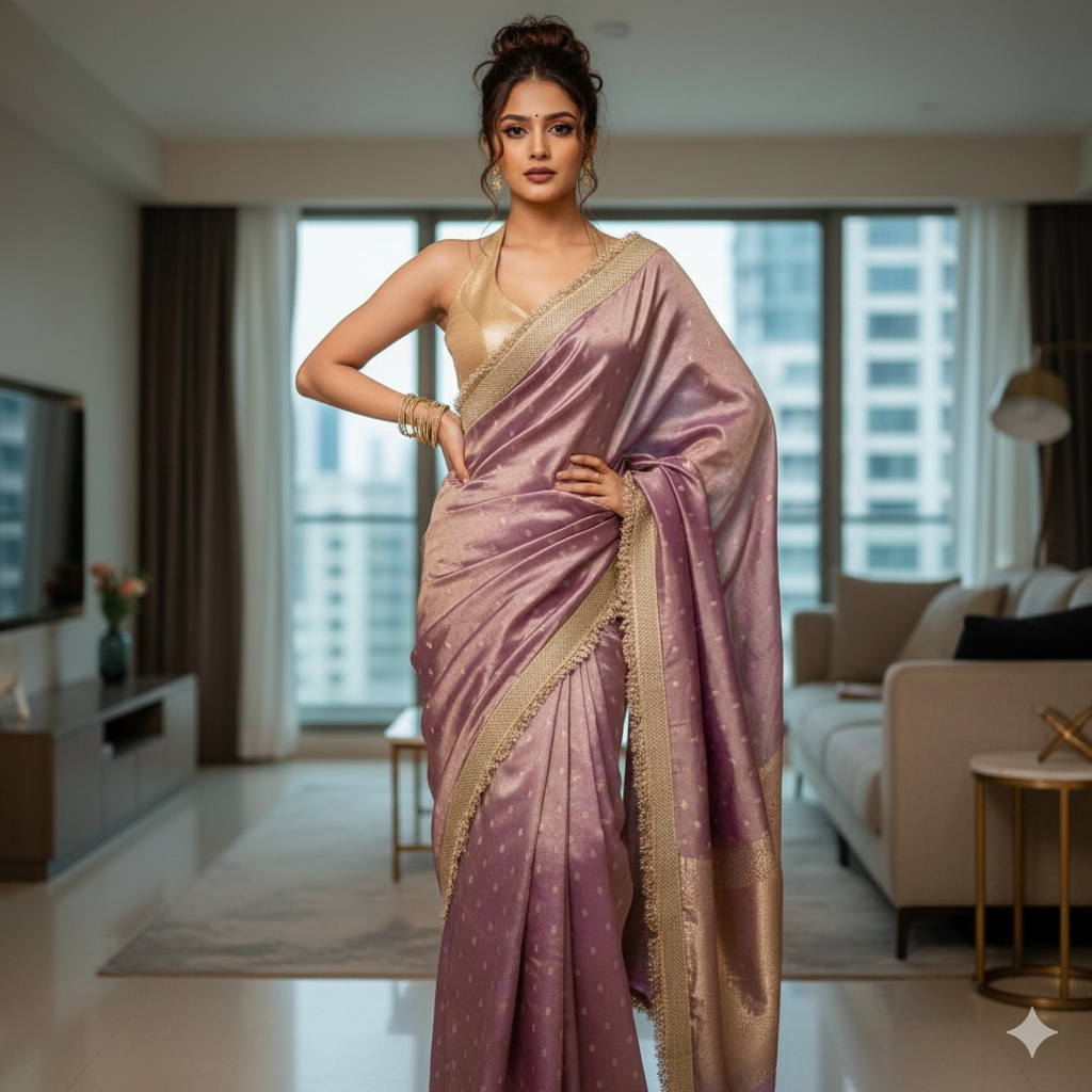 Discover the allure of Tissue Silk Sarees, where expert craftsmanship meets delicate design for an exquisite look.