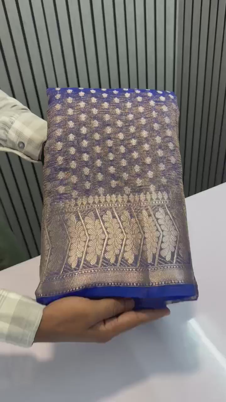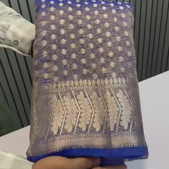 Get ready to turn heads in this Blue Banarasi Crush Tissue Silk Saree. Perfect for any occasion, this saree features a luxurious Banarasi Crush Tissue Silk fabric that offers a unique textured look. With its beautiful drape and elegant design, this saree is sure to make you stand out in the crowd. Elevate your style with this stunning saree.