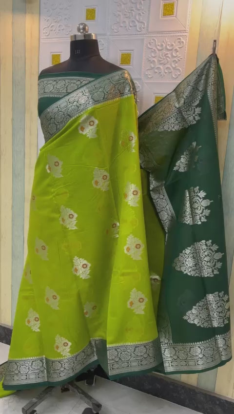 Grace meets craftsmanship in this exquisite Banarasi Georgette saree featuring intricate Meenakari floral motifs woven into soft silk. The delicate silver zari border adds a royal touch, while the vibrant contrast of lime green and bottle green makes it a visual delight. Light in weight, rich in detail – perfect for those who adore floral charm with traditional finesse.