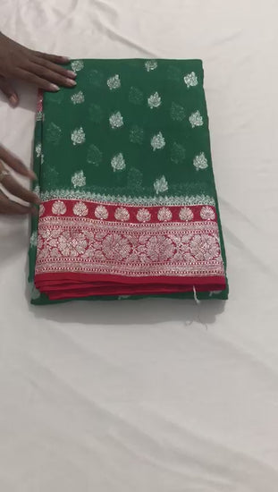 Indulge in the timeless elegance of our Banarasi Katan Georgette Saree. Made with the finest quality Banarasi Katan Georgette fabric, this saree exudes luxury and sophistication. With its intricate design and delicate craftsmanship, it is the perfect addition to any wardrobe. Elevate your style and make a statement with this stunning saree.