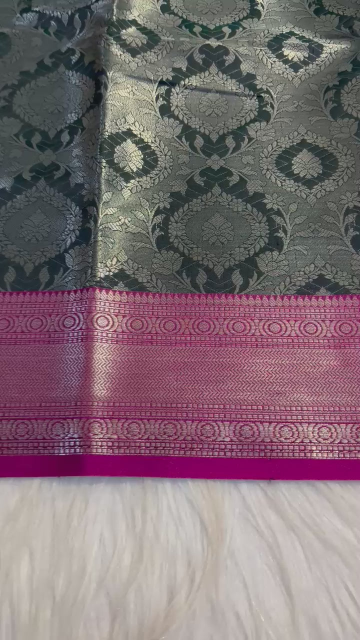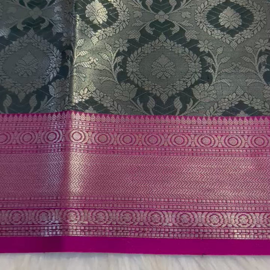Step into timeless grace with this exquisite Banaras Tissue saree, featuring a lustrous green body woven with intricate floral motifs and finished with a rich pink zari border. Crafted in premium Banarasi tissue silk, this lightweight saree beautifully blends traditional charm with festive elegance.