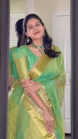 This beautiful Green Banarasi Tissue Silk Saree is perfect for any occasion. Made of high-quality material, it boasts a luxurious feel and stunning color. Its intricate Banarasi design adds a touch of elegance, making it a must-have for any wardrobe. Elevate your style with this timeless piece.