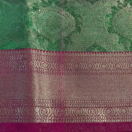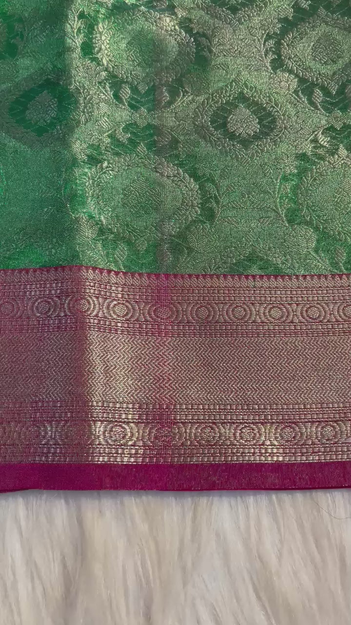 Step into timeless grace with this exquisite Banaras Tissue saree, featuring a lustrous green body woven with intricate floral motifs and finished with a rich silver zari border. Crafted in premium Banarasi tissue silk, this lightweight saree beautifully blends traditional charm with festive elegance.