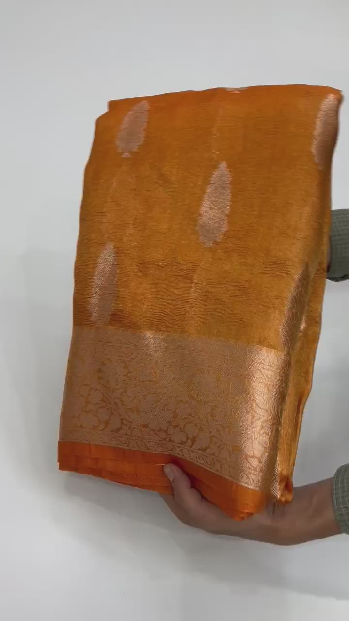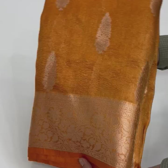 This elegant Banarasi Crush Tissue Silk Saree is expertly crafted with the finest quality semi silk. The unique crushed texture adds a touch of sophistication, making it perfect for any occasion. Revel in the opulent feel of the saree while looking effortlessly stylish. A must-have for any saree lover.
