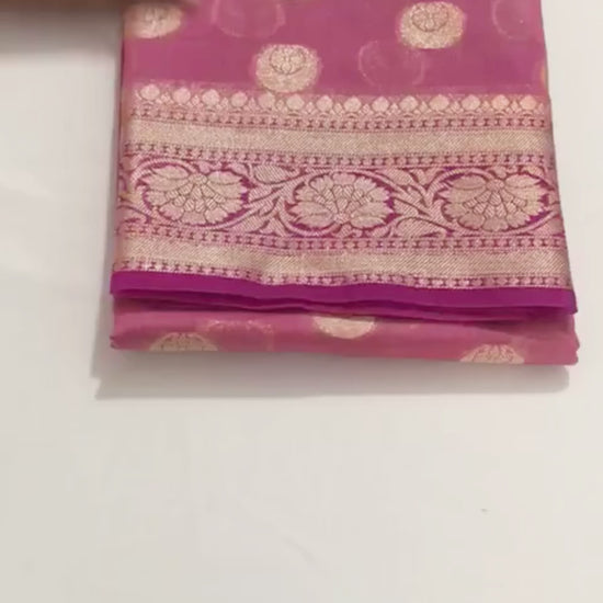 Update your traditional wardrobe with our Pink Banarasi Georgette Saree. Handwoven with rich, intricate patterns, this saree showcases the finest craftsmanship of the Banarasi region. The soft georgette fabric drapes elegantly and ensures utmost comfort, perfect for any occasion. Elevate your style with this timeless and beautiful piece.